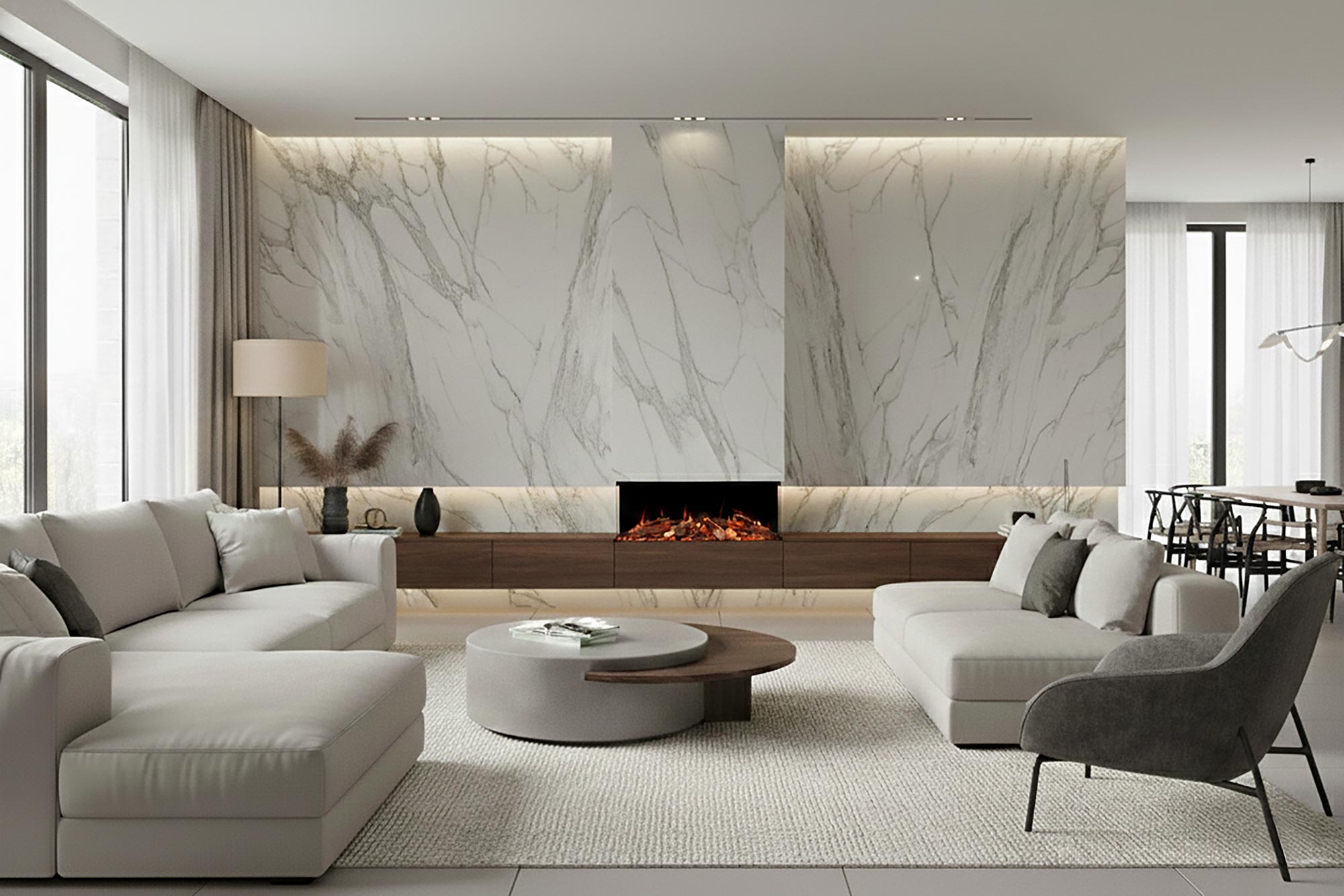 With its expansive 63-inch wide glass, the BonFire® 63 can be installed as a single-sided fireplace, a corner installation, or an impressive three-sided bay configuration. Its versatility goes even further. The BonFire® 63 can be connected to either 120V or 240V power, delivering increased heat output when operated on 240V for enhanced comfort in larger spaces.